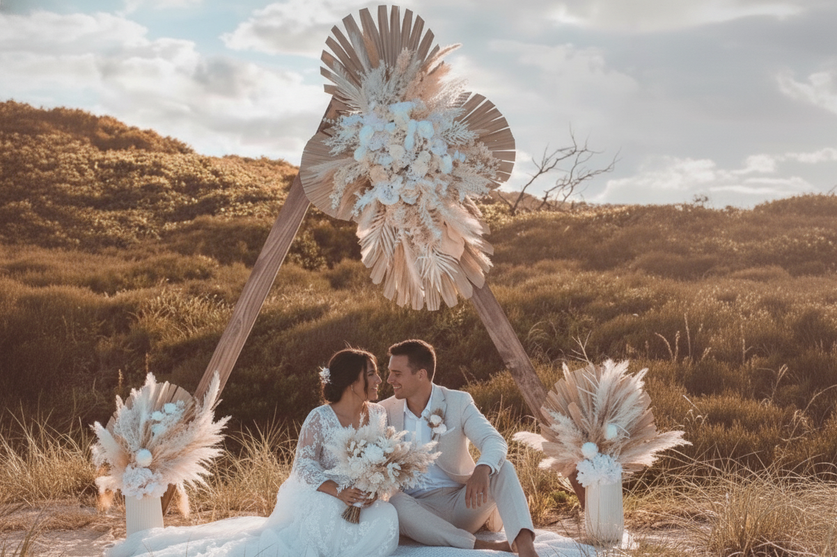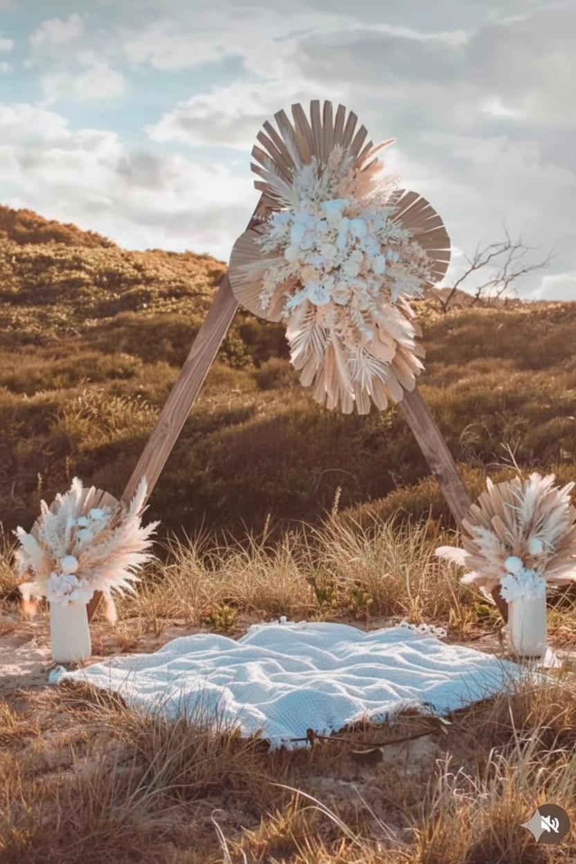 Our Timber Arbour 2m high that folds in half for easy transport, Large dried floral arrangement and 2 dried florals in pots set. Perfect for an elopement, wedding ceremony or family photoshoot.